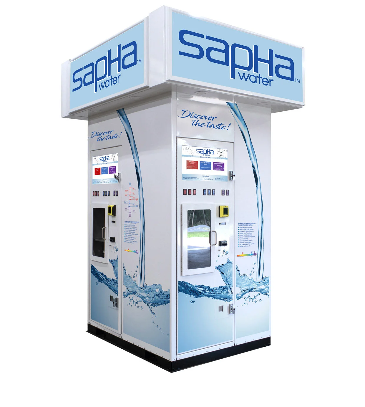 SapHa Water is revolutionizing the water industry with the arrival of the first-to-market commercial vending machine of it’s kind. What makes SapHa Water machines different than every other water machine on the market? Our machine serves Purified Reverse Osmosis (RO) water, Alkaline Mineral water and Alkaline Ionized water fresh on demand. This allows you, the retailer, to capitalize on THREE (3) INCOME STREAMS with one footprint. Retailers replacing their current RO machine with a SapHa Water KIOSK are generating an average of 55% increased revenue without customers needing to stand in line. The multiple dispensing stations on one footprint allow the customers to use all of the multiple dispensing stations at the same time 24/7. The additional water options allow the consumer to make healthier water choices and save time. Since the KIOSK is available 24/7 in the parking area or other outdoor location, your customers are able to refill their water containers at their most convenient time of day or night.
